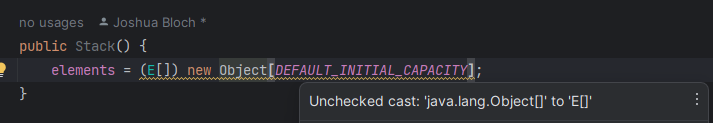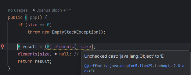 이 방법은 경고가 발생하지만, 컴파일러로 검사할 수 없기 때문에 우리가 직접 안전한지 확인해야한다. 안전하다면 @SuppressWarnings 어노테이션으로 최소한의 범위를 잡아 경고를 숨긴다.