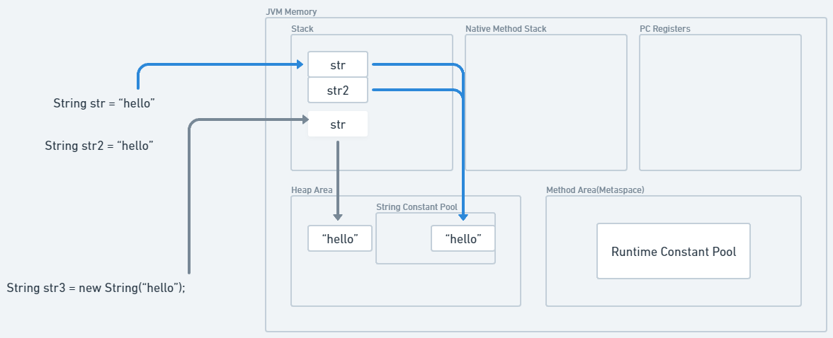 Q.문자열을 String str = "hello"; 라고 선언하면 어떻게 되나요?