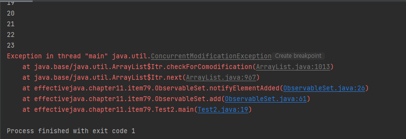 이 프로그램은 23까지 출력하고 오류가 발생한다. 옵저버의 added 메서드 호출이 일어난 시점이 notifyElementAdded가 옵저버들의 리스트를 순회하는 도중이기 때문이다. added 메서드는 ObservableSet의 removeObserver 메서드를 호출하고, 이 메서드는 다시 observers.remove를 호출하는데 여기서 문제가 발생한다.