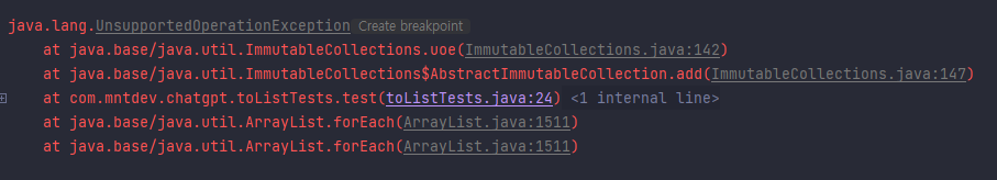 그럼 List.of로 생성한 리스트에 add를 하게 된다면 동일한 문제가 발생한다.