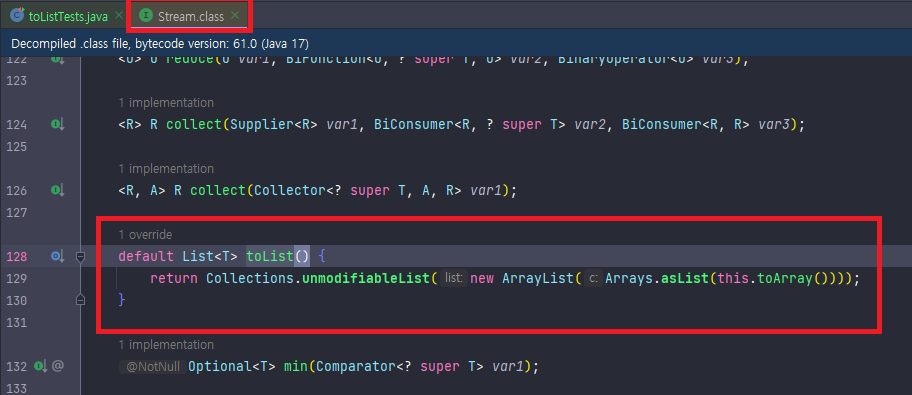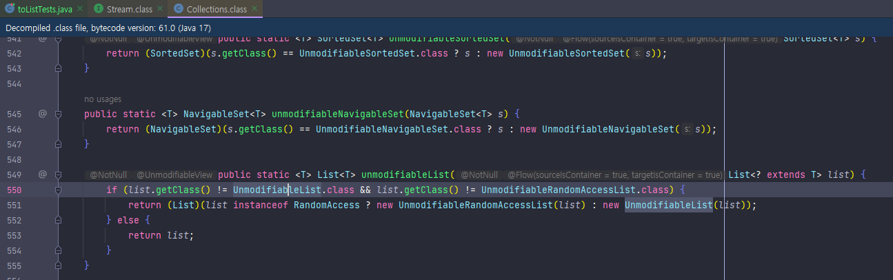 stream 인터페이스의 toList() 메소드를 확인해보자. default로 선언된 toList()는 기본적으로 Collections.unmodifiableList 을 호출하는데 불변리스트를 호출하는 것 이다.