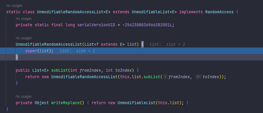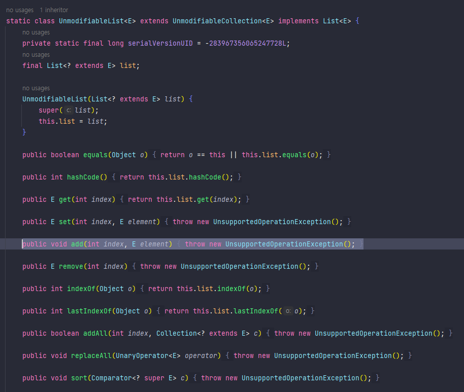 그럼 UnmodifiableRandomAccessList 클래스를 extends 하는 UnmodifiableList를 보면 된다.