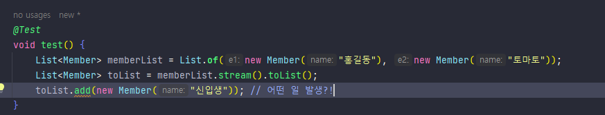 위 코드에서 단순히 Member를 만들고, List에 담아 stream을 통해 뭔가 처리 한 뒤에 toList로 다시 변환한다.