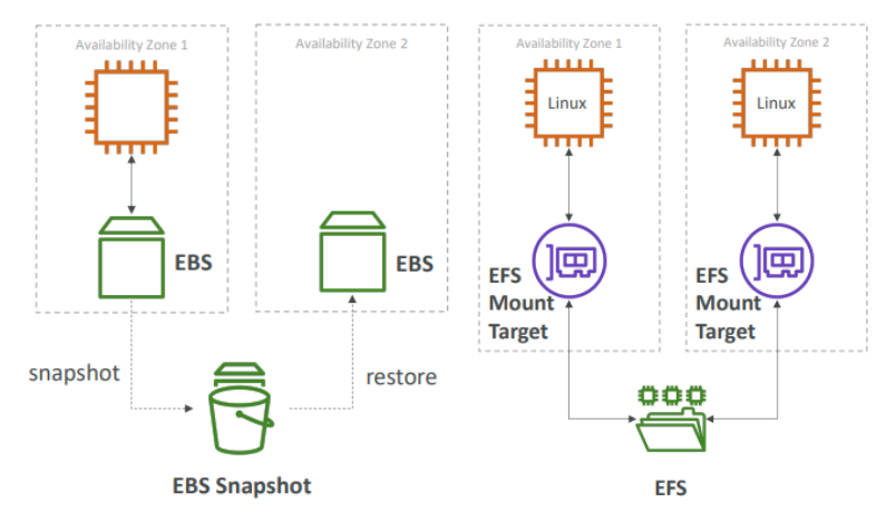 EBS, EFS, Instance Store 비교 필수! ✅ EFS 사용 시점, NFS 옵션 (스토리지 계층, AZ, 성능 Mode) 숙지! 📚