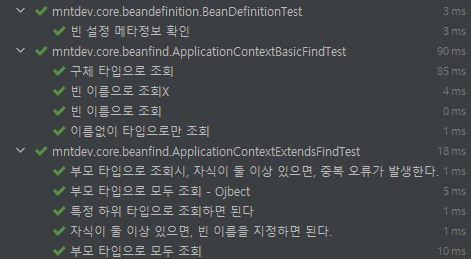 위와 같은 방식으로 조회가 가능하며 일반화 시키자면 ac.getBean(“빈 이름”,타입);으로 Bean 이름과 조회할 타입의 class를 넘겨주면 getBean으로 조회할 수 있습니다. 그 외에도 이름을 입력하지 않고 타입으로만 조회할 수 있으며, 부모 타입으로 조회하여 자식 타입까지 한번에 조회도 가능합니다. Object 타입으로 조회하면 스프링 컨테이너에서 사용하는 모든 Bean을 조회할 수 있습니다.
