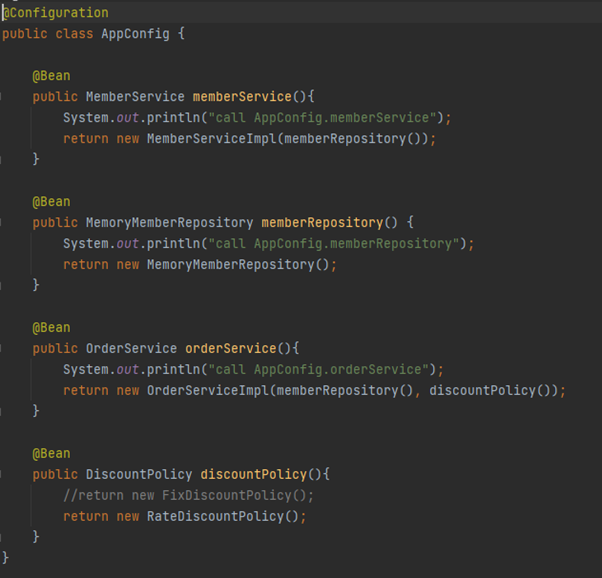 위의 AppConfig.java 파일에서 보기에는 memberRepository는 총 3번 실행되게 됩니다. 하지만 그렇게 된다면 new MemoryMemberRepository();를 총 3번 return 하게 되고, 이는 3개의 instance가 생성되는 것처럼 보입니다. 하지만 @Configuration을 통해서 그것을 방지하게 됩니다. 그러면 @Configuration이 실제로 그렇게 동작하는지 살펴보겠습니다.