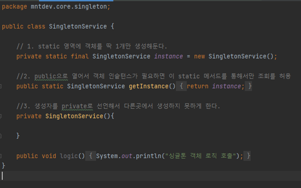 순수 자바의 싱글톤 패턴은 아래와 같은 형식으로 사용이 가능합니다.