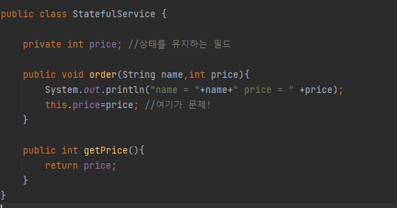 문제는 싱글톤 패턴이기에 사용자 A는 10000원의 물품을 주문했는데 실제 결제에서는 중간에 Thread B인 사용자 B가 20000원을 주문하여 service1.getprice()를 했을 때, 20000원이 조회되는 경우가 발생합니다. 즉 사용자 A는 자신이 주문한 금액이 아닌 금액만큼 결제가 될 가능성이 있다는 문제가 발생합니다.