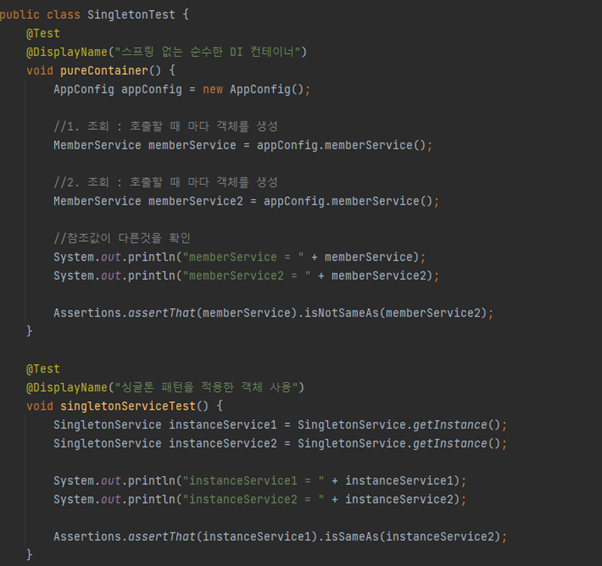 스프링 컨테이너는 싱글톤 패턴을 적용하지 않아도 Bean으로 등록된 객체의 instance를 싱글톤으로 관리해줍니다.