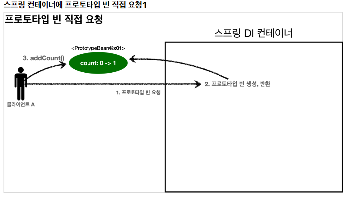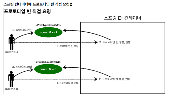 - 프로토타입 : 스프링 컨테이너가 프로토타입 빈의 생성과 의존관계 주입까지만 관여하고 더는 관리하지 않는 짧은 범위의 스코프