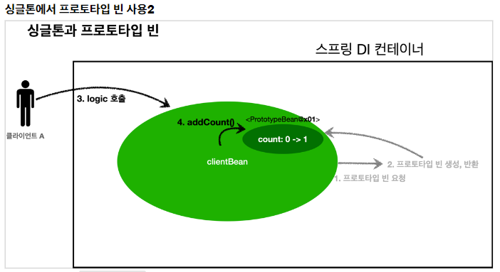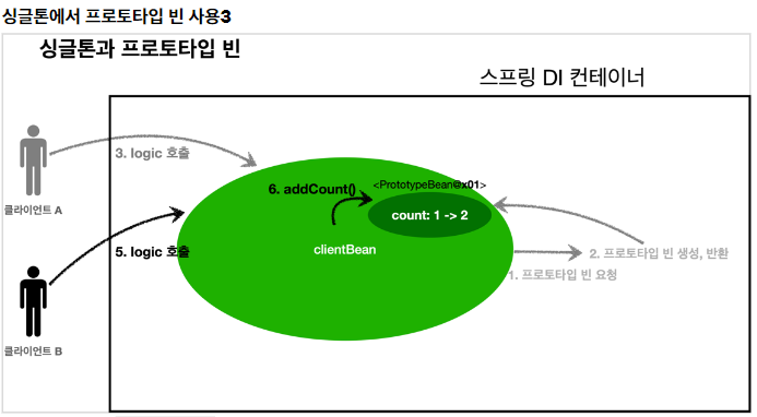 즉 위 그림과 같이 클라이언트 B는 addCount를 했을 때, count가 2가 되는 문제점이 발생한다. 그 이유는 DI 컨테이너에서 싱글톤 빈을 생성하는 과정에서 PrototypeBean이 같이 생성되어 생명주기를 공유하기 때문이다. 그래서 다른 클라이언트에서 logic을 호출할 경우에도, prototype으로 스코프가 잡히는게 아닌, 마치 싱글톤처럼 잡혀버리는 문제가 생긴다. 이런 문제를 해결하기 위해 Provider가 있다.
