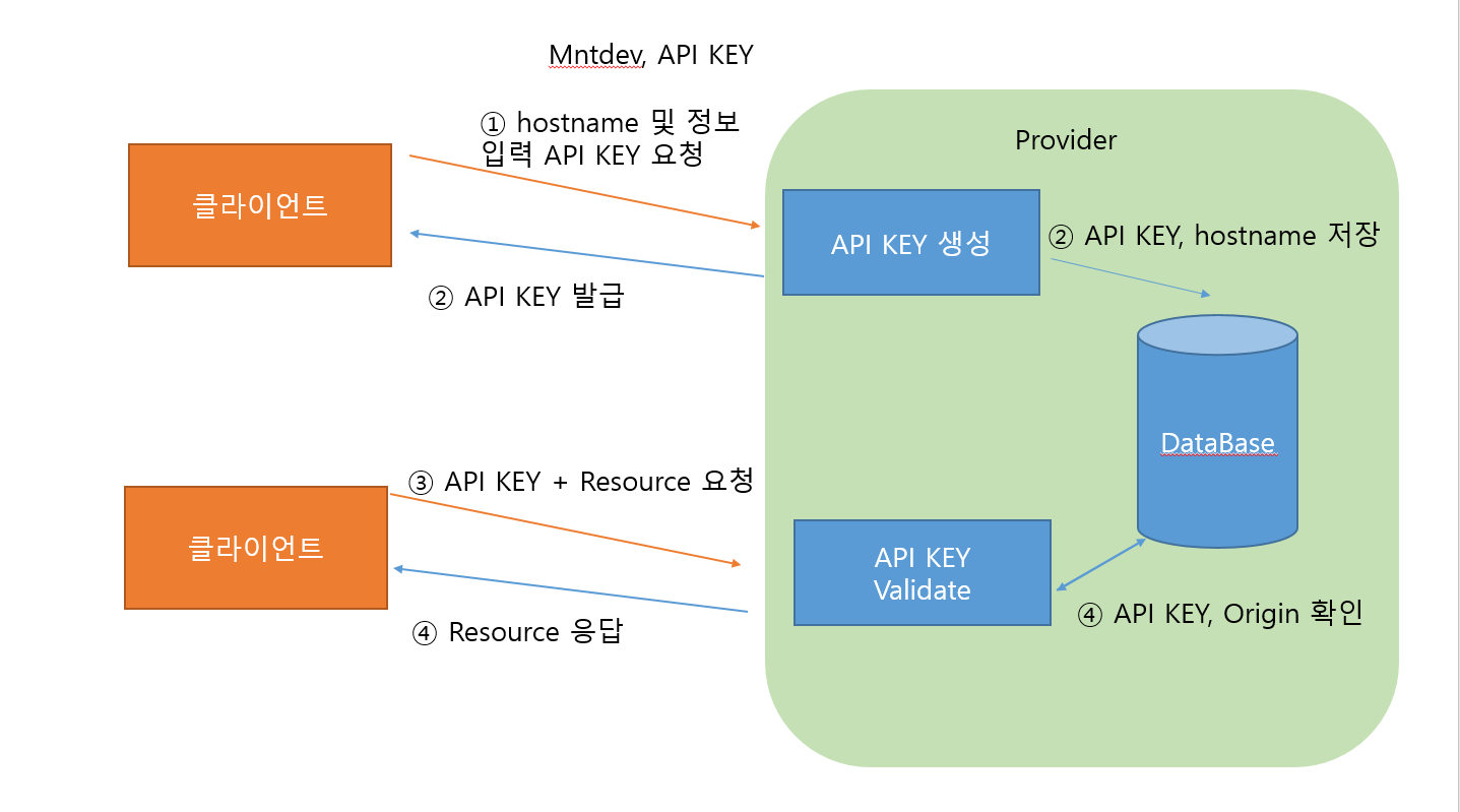 1.클라이언트 개발자는 Provider에 hostName 및 기타 정보를 이용해 API KEY를 요청한다.