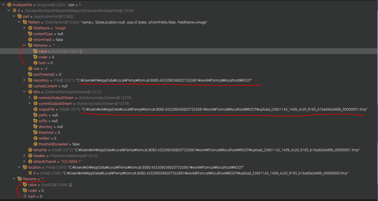 이렇게 생긴 임시 폴더에 파일을 잠깐 저장하게 되는데 .tmp라는 형태로 임시 저장하여 multipartFile 객체에서