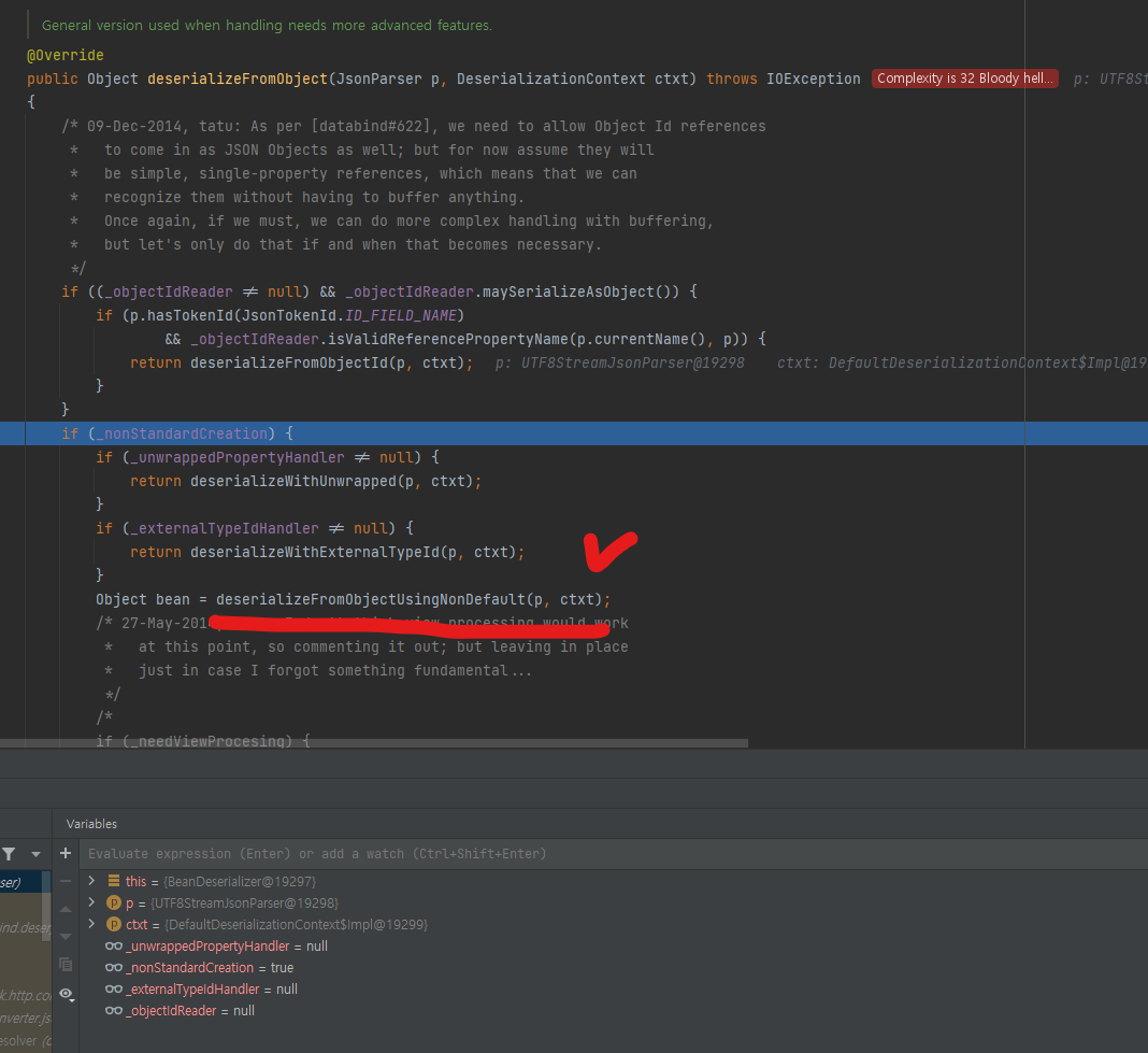 그걸 확인하기 위해서는 서블릿에서 요청받은 데이터를 Deserialize 해주는 BeanDeserializer를 디버깅했다.
