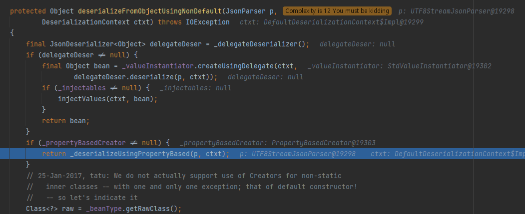 이후 BeanDeserializerBase.java의 deserializeFromObjectUsingNonDefault 메서드를 통해 propertyBaseCreator가 존재하기 때문에(AllArgmentConstructor나 다른 생성자가 있는 경우) _deserializeUsingPropertyBased 함수가 호출된다.