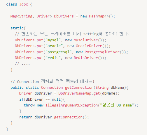 이런 유연함은 서비스 제공자 프레임워크를 만드는 근간이 됩니다. 대표적으로 JDBC가 있습니다.