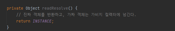 둘 중 하나의 방식으로 만든 싱글턴 클래스를 직렬화(serialize) 하려면 단순히 Serializable을 구현한다고 선언하는것으로는 부족합니다. 모든 인스턴스 필드를 일시적(transient)이라고 선언하고 readResolve 메서드를 제공해야 합니다. 이렇게 하지 않으면 serialize된 인스턴스를 deserialize할 때 마다 새로운 인스턴스가 생성됩니다. 즉 가짜 객체가 탄생하게 되기 때문에 이를 예방하려면 readResolve 메서드를 추가해야 합니다.