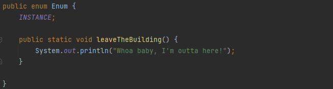 public 필드 방식과 비슷하지만, 더 간결하고, 직렬화하기 쉽습니다. 심지어 아주 복작한 직렬화 상황이나 리플렉션 공격에서도 제2의 인스턴스가 생기는 일을 완벽히 막아줍니다. 조금 부자연스러워 보이지만 대부분 상황에서 원소가 하나뿐인 Enum 타입이 싱글턴을 만드는 가장 좋은 방법입니다. 단 만들려는 싱글턴이 Enum 외의 클래스를 상속해야 한다면 이 방법은 사용할 수 없습니다.(열거 타입이 다른 인터페이스를 구현하도록 선언은 가능합니다.)