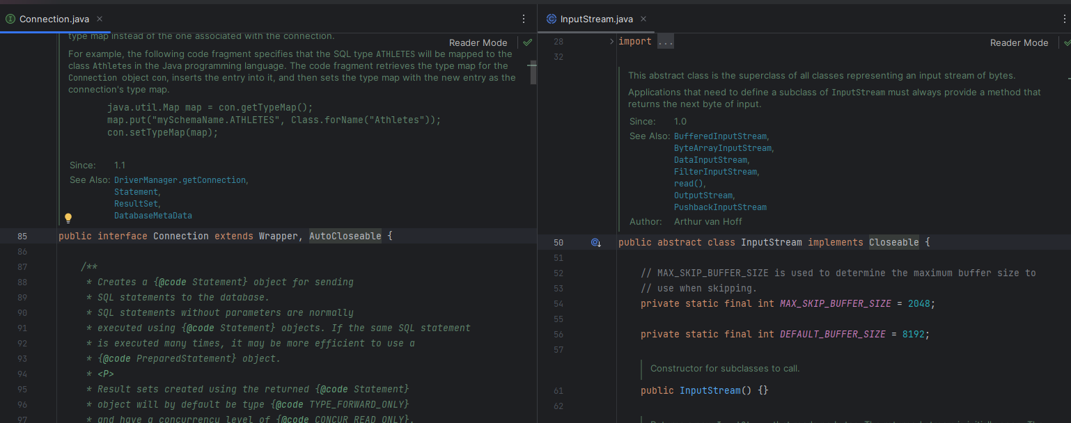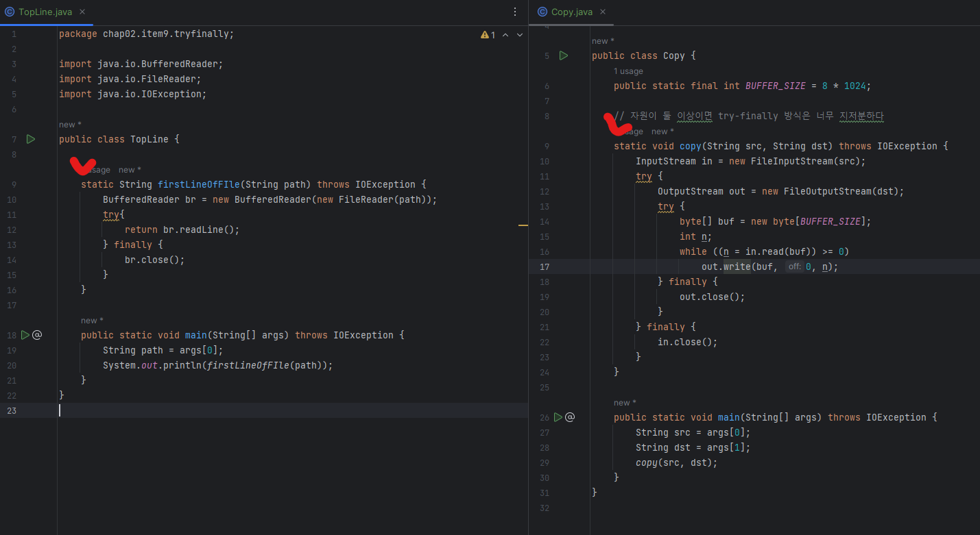 위 예시를 보면 왼쪽에서 하나의 자원을 사용하는 경우는 그나마 괜찮지만, 2개 이상의 자원을 close해야 하는 경우에는 가독성이 좋지않고, 코드가 지저분해 보입니다.