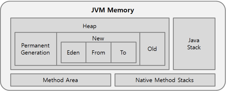 위와 같이 PermGen은 Heap영역에 있지 않습니다. Java는 Heap Memory와 Non-Heap Memory 두 가지 종류의 메모리를 관리합니다. Oracle GC 개발자 블로그에서는 아래와 같은 장표를 통해서 Permanent Generation 영역은 힙 영역이 아닌걸 확인할 수 있는 구조로 포스팅을 했습니다.
