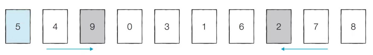 - [Step 1] 현재 피벗의 값은 '5'이다. 왼쪽에서부터 '5'보다 큰 데이터를 선택하므로 '9'가 선택되고
