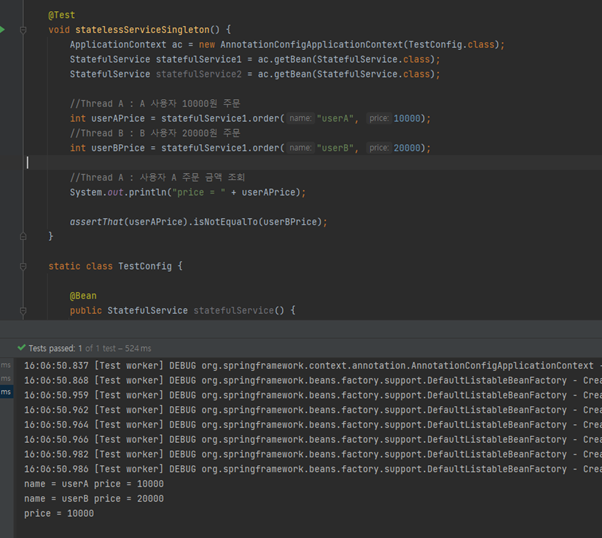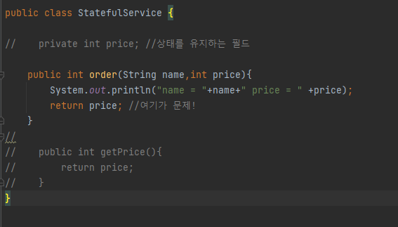 문제는 싱글톤 패턴이기에 사용자 A는 10000원의 물품을 주문했는데 실제 결제에서는 중간에 Thread B인 사용자 B가 20000원을 주문하여 service1.getprice()를 했을 때, 20000원이 조회되는 경우가 발생합니다. 즉 사용자 A는 자신이 주문한 금액이 아닌 금액만큼 결제가 될 가능성이 있다는 문제가 발생합니다.