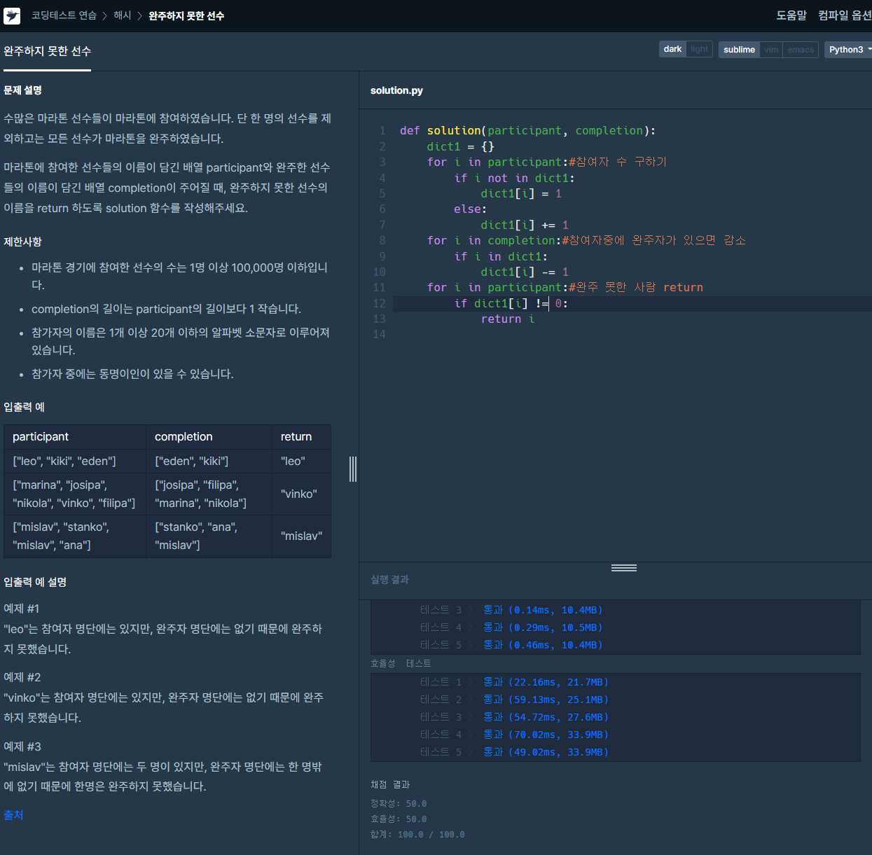 [프로그래머스] 완주하지 못한 선수 파이썬 문제 풀이