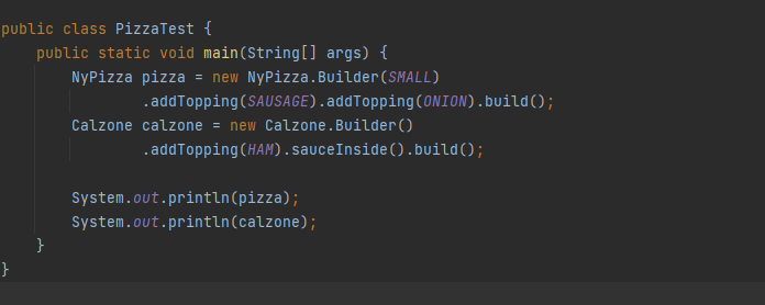 각 하위 클래스의 빌더가 정의한 build 메서드는 해당하는 구체 하위 클래스를 반환하도록 선언합니다. NyPizza.builder는 NyPizza를 반환하고, Calzone.builder는 Calzone을 반환한다는 뜻입니다. 하위 클래스의 메서드가 상의 클래스의 메서드가 정의한 타입이 아닌, 그 하위 타입을 반환하는 기능을 공변 타이핑이라고 합니다.